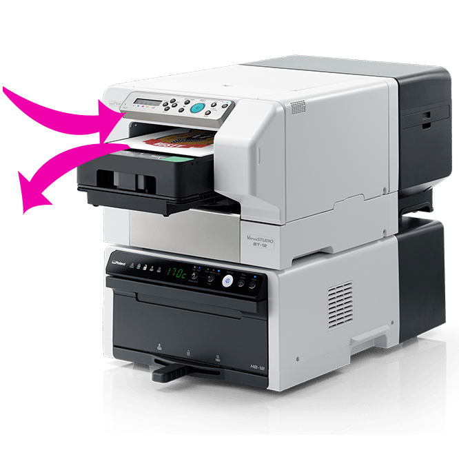 The BT-12 was designed to be powerful and easy to use at any experience level. Anyone can easily create original products of exceptional quality without special skills, training, or familiarity with printing. The optional cassette-type HB-12 finisher safely fixes the ink in the fabric while preventing exposure to high temperatures, so it can even be used in stores.