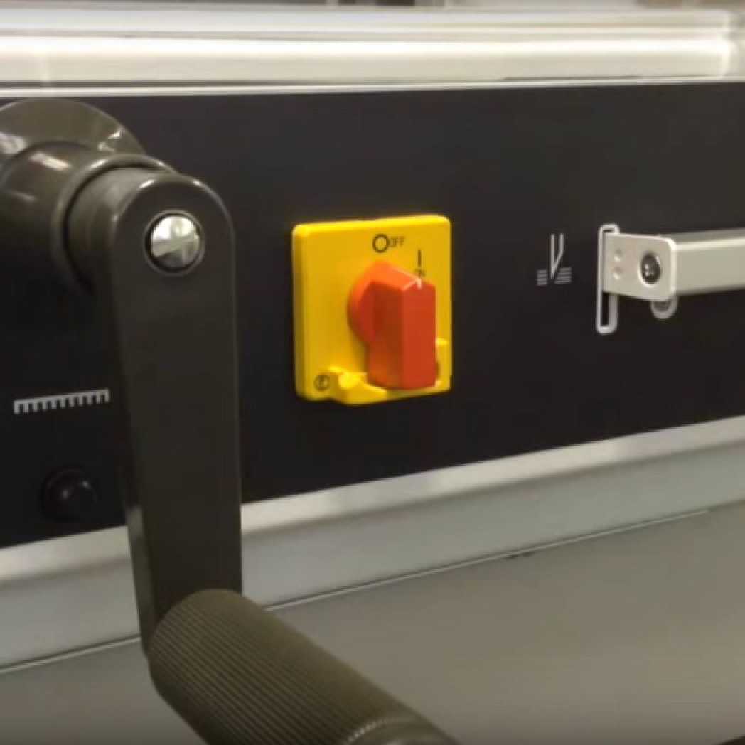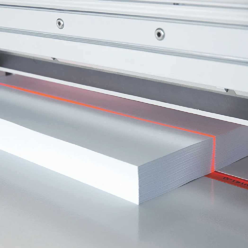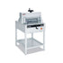 With the MBM Triumph™ 4815 semi-automatic cutter, you get the same world-renowned ease-of-use, power and precision as the Triumph™ 4315 cutter, but with double the cutting capacity, as it can power through an astounding 3" thick stack. The 4815 paper cutter can cut media up to 18 ⅝" wide, and is mounted onto a sturdy and convenient stand that sits comfortably at 37" high, and includes a shelf for accessory and paper storage. As with all MBM Triumph™ cutters, the 4815 features the comprehensive SCS™ safety system that provides more protection for your operators than any other cutter safety package. To use, simply place your stack of paper into the cutter opening and rotate the calibrated hand crank on the front to adjust the back gauge. Use the LED cutting line and cm/in display screen to set the back gauge into your desired location. Use the wheel on top to depress the clamping mechanism against your stack. The blade itself is then activated when the user presses both of the cut bars at the same time. It is that simple - there are no confusing settings or adjustments needed. When you buy the MBM Triumph™ 4815 semi-automatic electric paper cutter online, you also have the security and safety measure of a key-activated power switch, so only authorized users are allowed access to the machine. Included free with your purchase is one standard cutting stick, one high quality German steel blade (replacement blades available), an easy-access tool holder and a jogging block tool to help you square your stack prior to cutting.