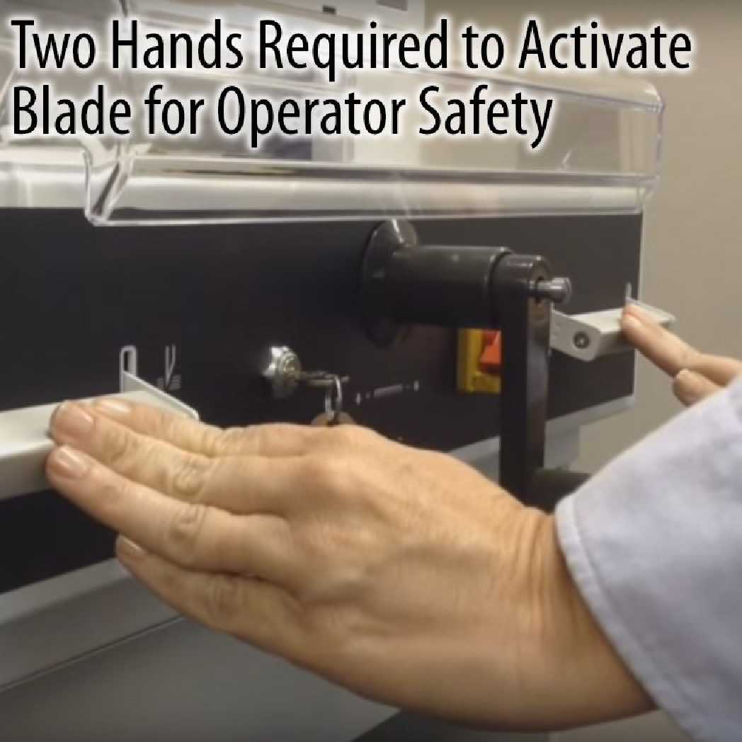 Powerful, semi-automatic cutter with electric blade drive, manual spindle clamp, and EASY CUT blade activation.