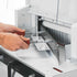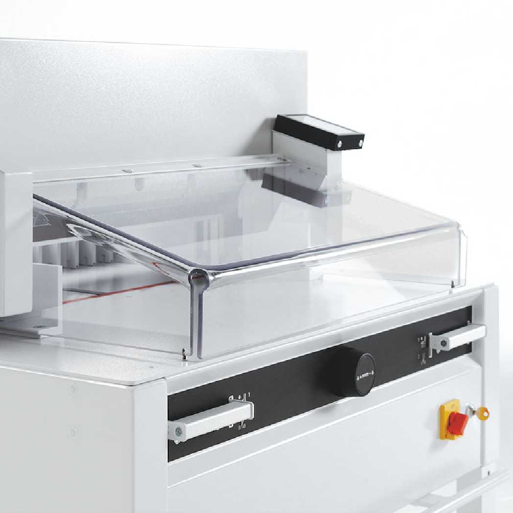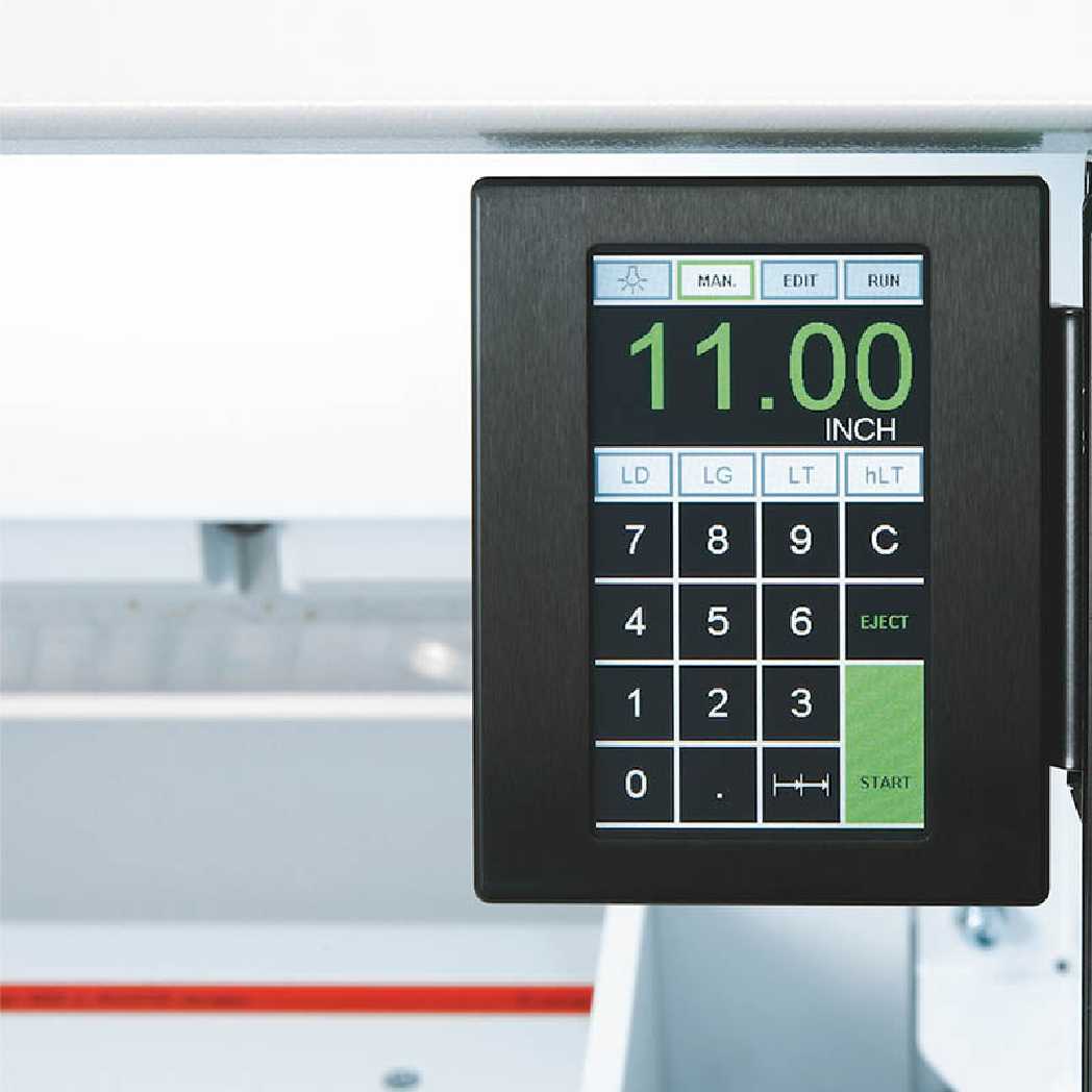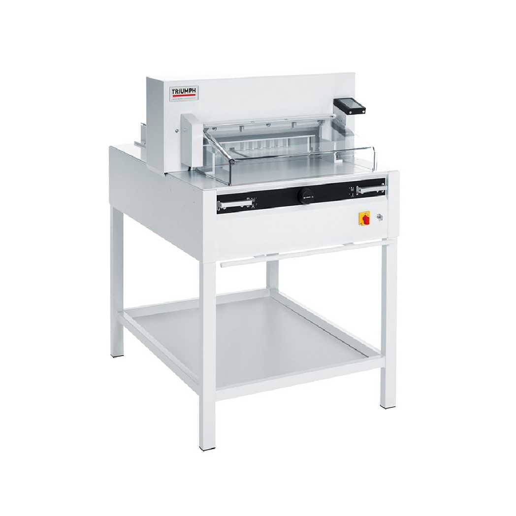 The MBM Triumph 5255 Automatic Programmable Paper Cutter includes great features including: a programmable "EP" back gauge control module with LED display stores 9 programs (up to 9 steps each) and frequently used measurements, a control module that features repeat cut and eject functions, an electric blade, clamp, and back gauge drive, an automatic clamp that can be lowered or raised independently from the blade, and an electronic hand wheel with variable speed control for manual back gauge setting. The MBM Triumph 5255 Paper Cutter also includes: dual side guides on front and rear tables, optical cutting line, a solid steel blade carrier and is UL and C UL approved. The MBM Triumph 5255 Paper Cutter also includes several great safety features including: an external blade depth adjustment, two-hand operation, transparent safety guards on front and rear tables, disc brake for instant blade stop, automatic blade return from any position and safety lock with key and main switch. This Model has been updated by MBM. It now features Easy Cut blade activation bars, 20 3/8" cutting width, touchpad control module and a tool holder, as a result the model has changed to 5255 (from 4850EP).