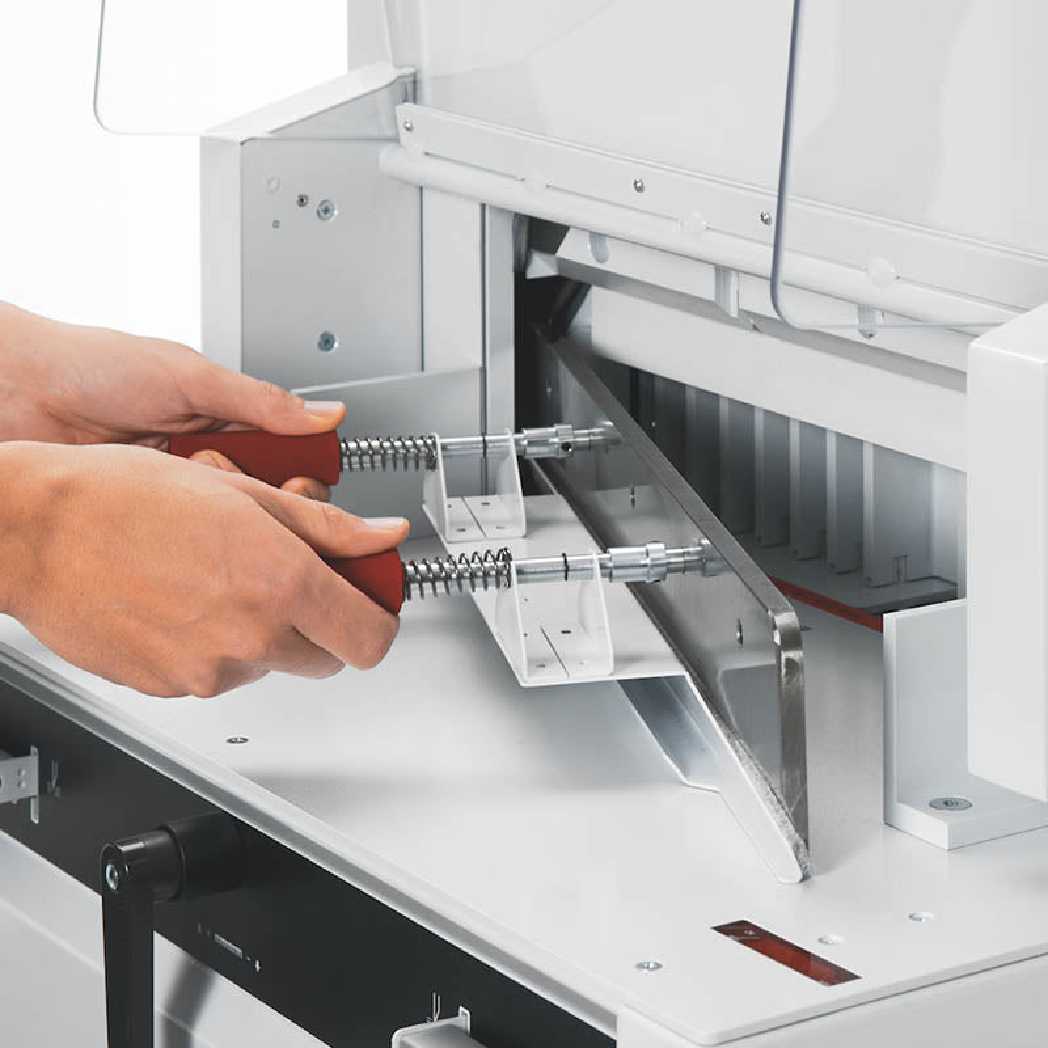 Safety concerns are put to bed with the MBM Triumph SCS® Safety Cutter System comprehensive package that ensures the protection of users. This package includes the following features: patented EASY CUT electronic blade activation bars for true two-hand operation; IR light beam safety curtain on front table; transparent safety cover on rear table; main switch and safety lock with key; 24 volt controls (low voltage); patented IDEAL safety drive; automatic blade and clamp return from every position; disc brake for instant blade stop; blade changing device covers cutting edge of blade; blade depth adjustment from outside of machine; blade and cutting stick can be changed without removing covers.