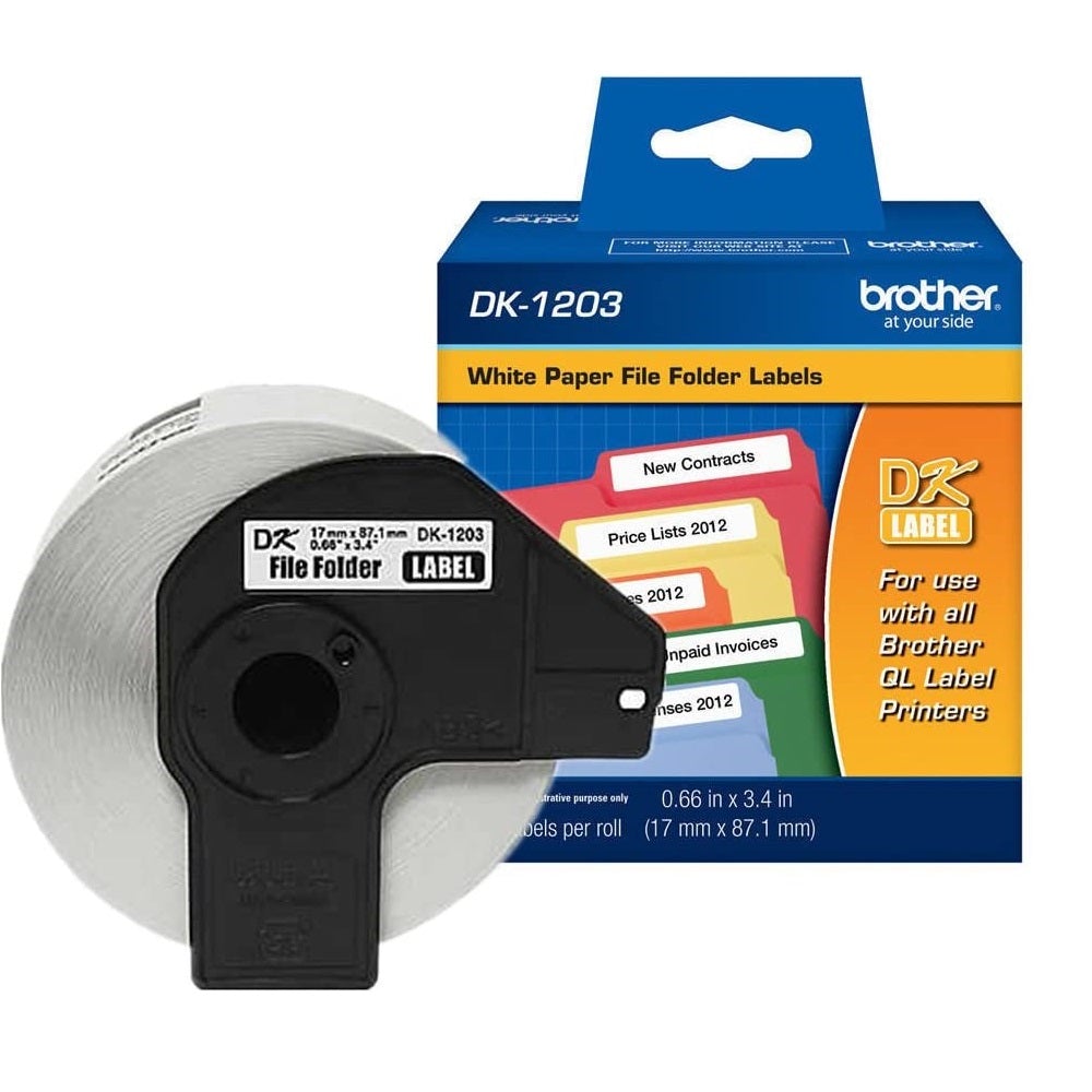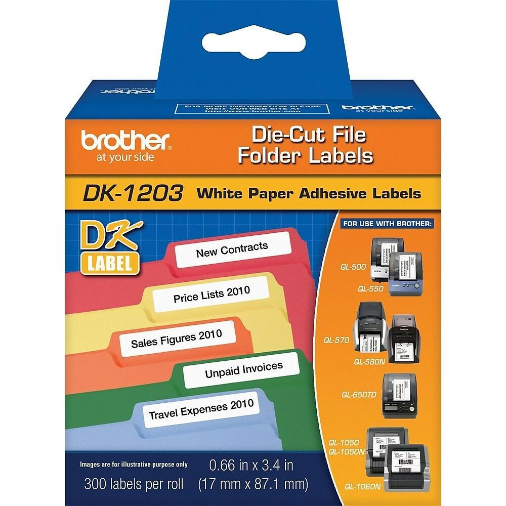 This printer label tape. Compatible with select Brother QL direct thermal label printers, this Brother DK-series die-cut printer file-folder label tape is easy to use and prints clear, professional titles. Brother DK1203 white paper file folder labels make it easy to look professional and stay organized. This roll of 300 adhesive die-cut labels is compatible with many QL direct thermal label printers. Print crisp black text and graphics on these Dura-coated labels that are the perfect size for labeling files and other smaller items.