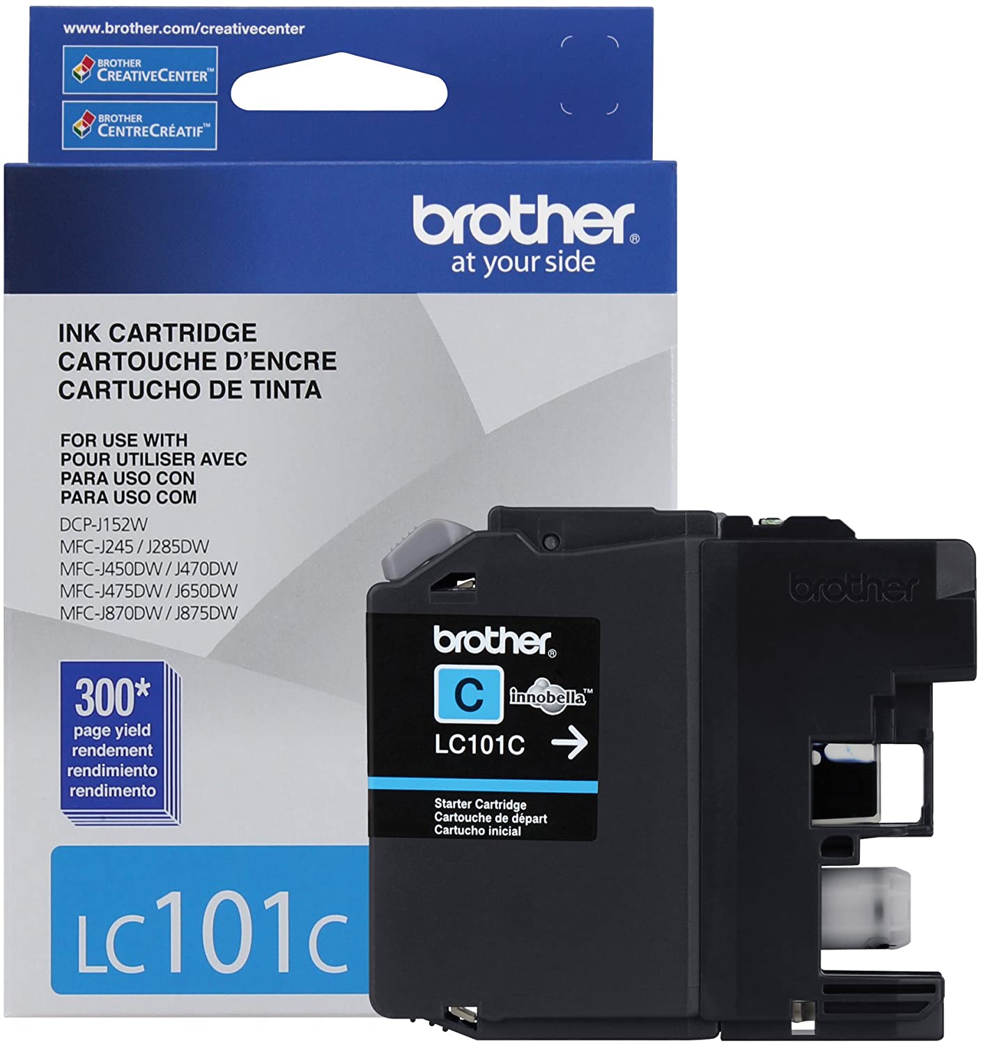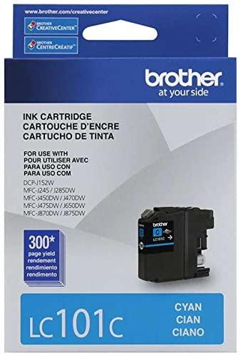 Original Brother Cartridges: Brother LC101C Ink Cartridge is a genuine cartridge for your Brother Printer. Produce archival-quality documents with this long-lasting ink cartridge. Brother LC101C Brother ink cartridge is specially designed for use work with DCP-J152W, MFC-J245, MFC-J285DW, MFC-J450DW, MFC-J470DW, MFC-J475DW, MFC-J650DW, MFC-J870DW, MFC-J875DW. Designed to use ink effectively, saving money between cartridges. This Brother LC101 high-yield ink cartridge has a production capacity of 300 pages and contains cyan ink for brilliant results with every print.