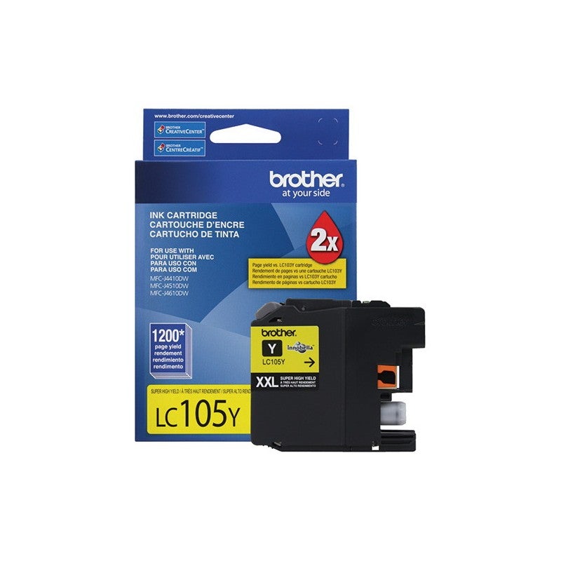 Genuine Brother Ink Cartridge: Brother LC105Y yellow super high yield Ink Cartridge. Brother printers are smart printers, equipped with low ink or toner intelligence that will detect when your ink or toner is running low. LC105Y ink cartridge work with Brother Color Inkjet Printer Models MFC-J4310DW, MFC-J4410DW, MFC-J4510DW, MFC-J4610DW, MFC-J4710DW, MFC-J6520DW, MFC-J6720DW, MFC-J6920DW. this LC105YS ink cartridge has a super high yield of up to 1,200 pages.