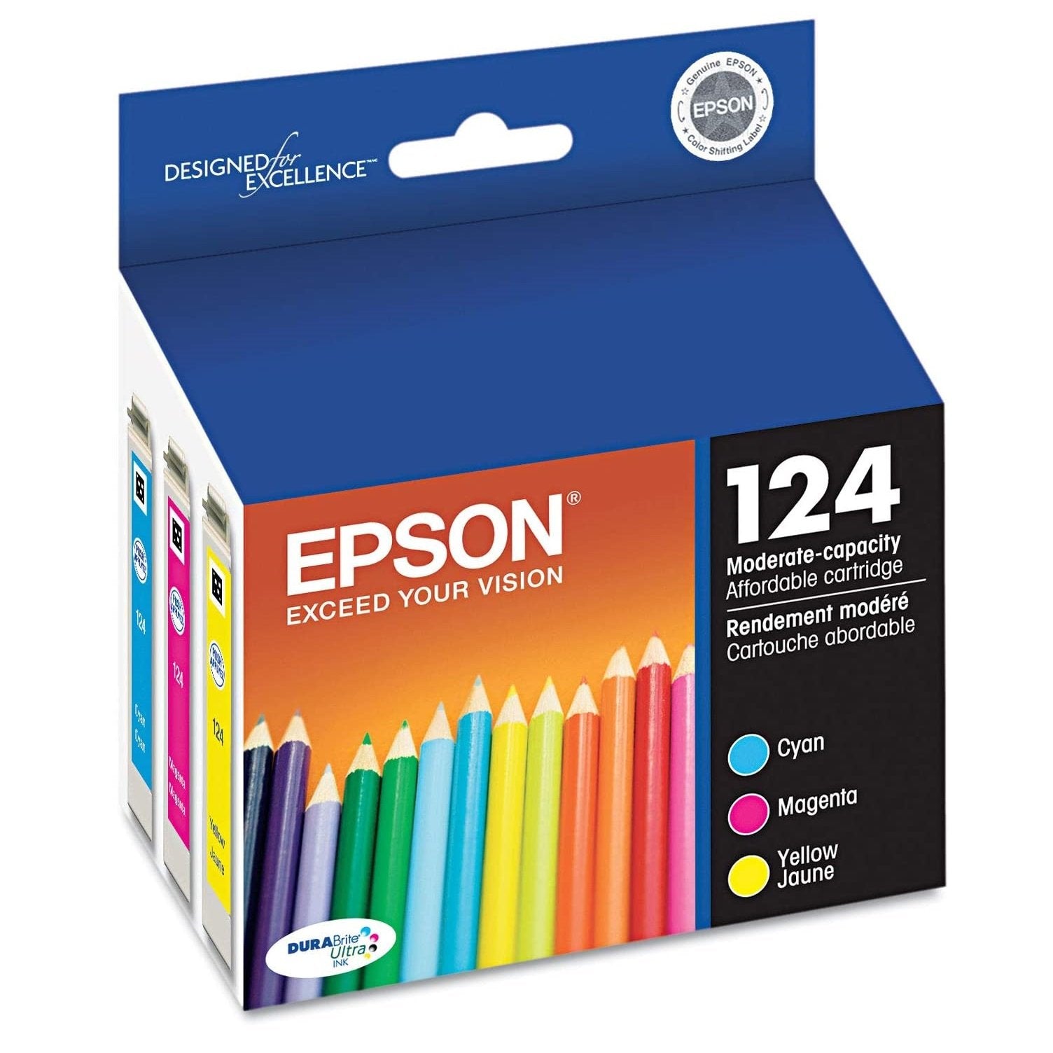 This Epson 124 Durabrite combo ink cartridge is sold individually and is compatible with select Epson photo printers and laser printers for versatility.