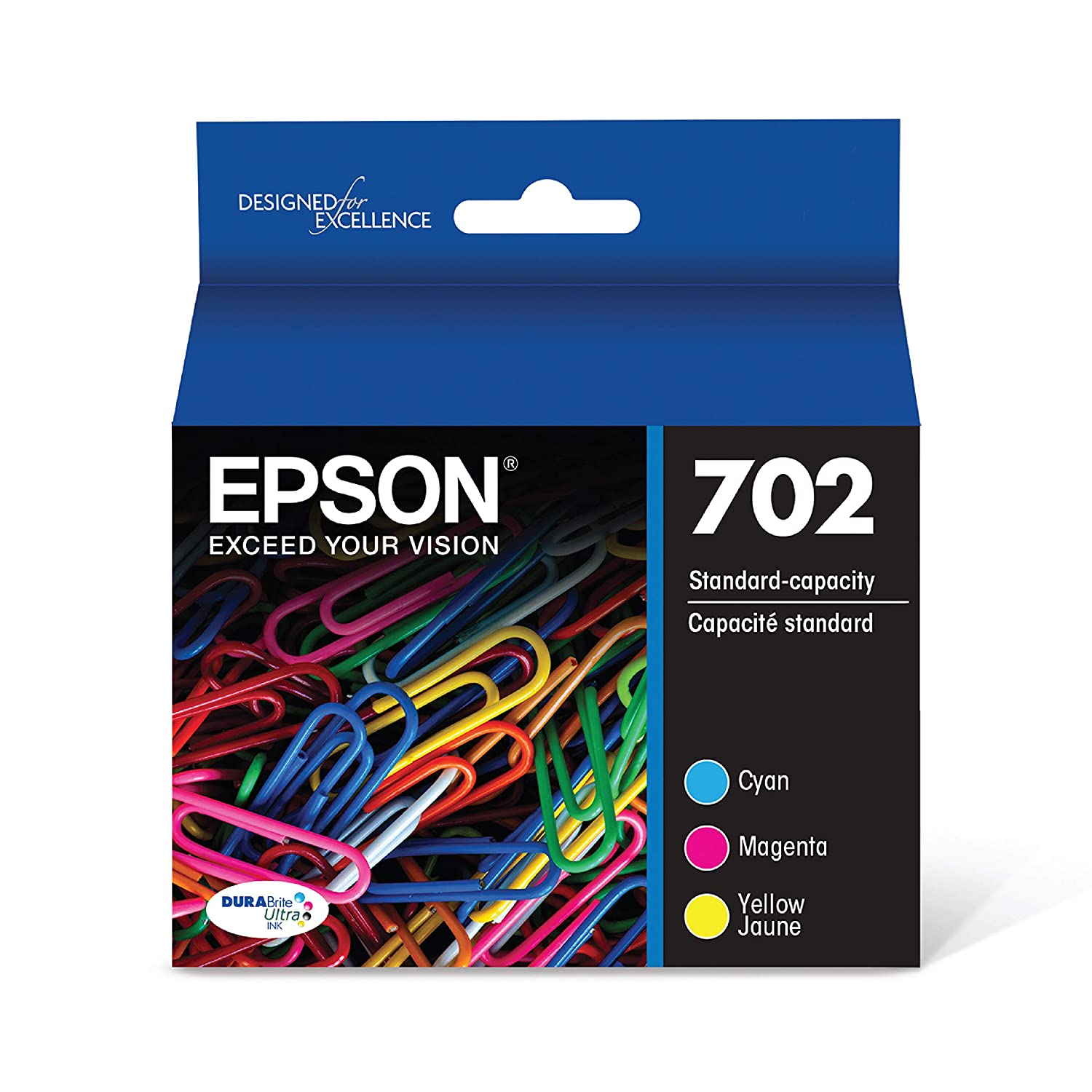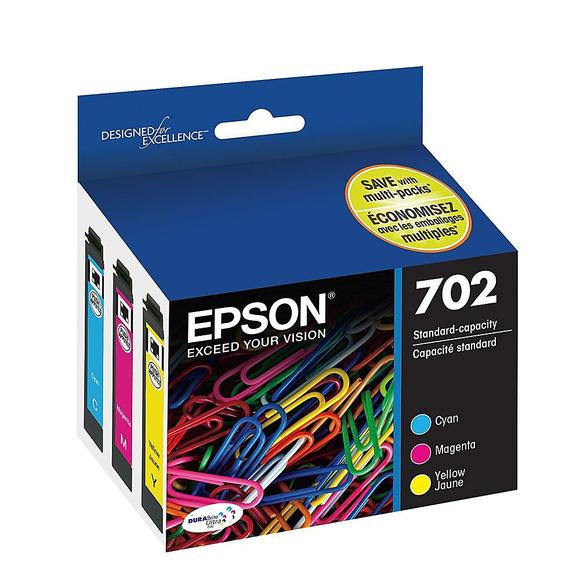 This Epson 702 tri-color ink cartridge is sold individually and is compatible with select Epson photo printers and laser printers for versatility.