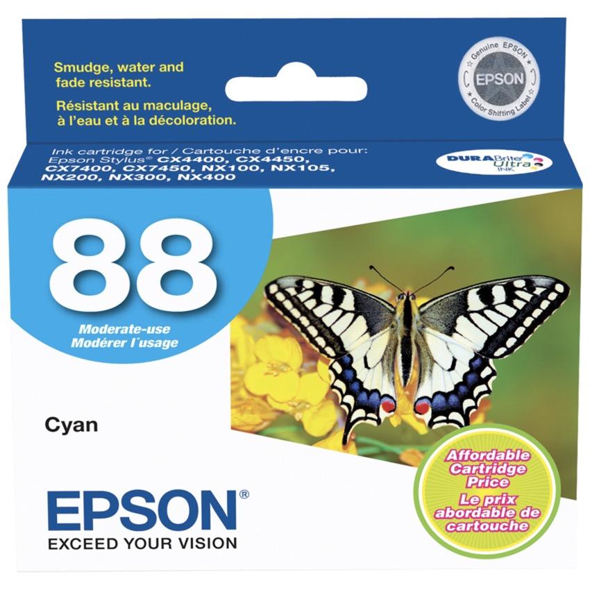 This Epson 88 Durabrite cyan ink cartridge is sold individually and is compatible with select Epson photo printers and laser printers for versatility.