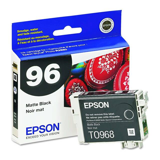 This Epson 96 matte black ink cartridge is sold individually and is compatible with select Epson photo printers and laser printers for versatility.