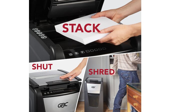 Spend less time shredding and more time on other tasks. GBC AutoFeed+ Shredders take the manual work out of shredding to make your day easier. Simply stack, shut and walk away!