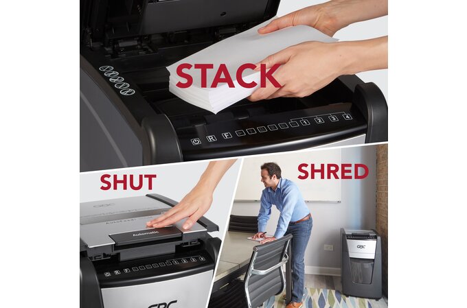 Spend less time shredding and more time on other tasks. GBC AutoFeed+ Shredders take the manual work out of shredding to make your day easier. Simply stack, shut and walk away!