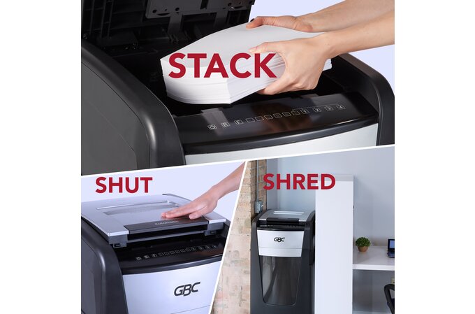 Spend less time shredding and more time on other tasks. GBC AutoFeed+ Shredders take the manual work out of shredding to make your day easier. Simply stack, shut and walk away!