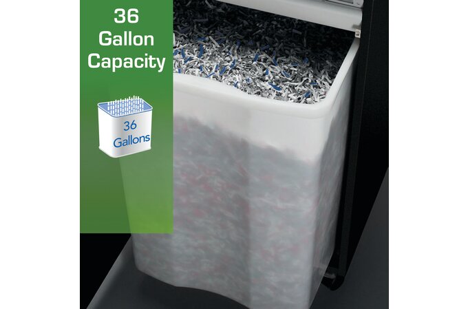 - Large 36-gallon pull-out waste bin provides plenty of space for shreds. Bin full indicator lets you know when it needs emptying. Machine shreds up to 25 sheets at a time.