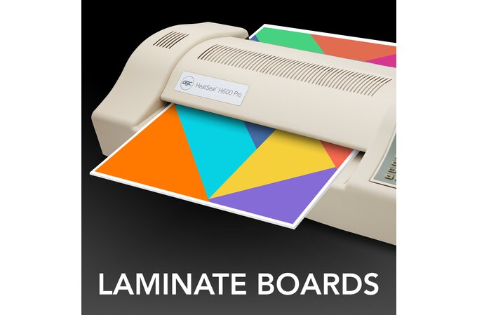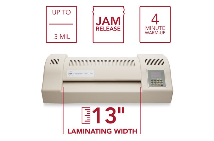 H600 Pro pouch laminator uses 4 heated rollers to provide professional lamination results. Easy to use keypad control panel with LCD readout. Accepts documents up to 13" wide. Laminates pouches 1.5 to 10 mil.
