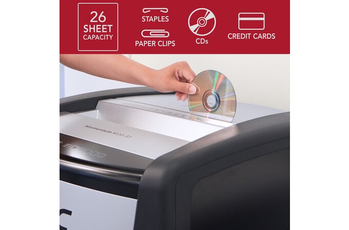 Shred more with the Momentum Shredder. This powerful machine easily shreds your confidential documents, as well as CDs, credit cards, paper clips, staples and junk mail.