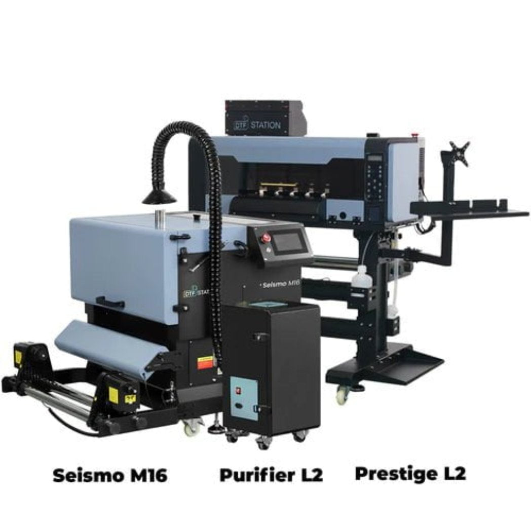 Enhance your DTF printing setup by bundling the Prestige L2 DTF Roll Printer with the Seismo M16 and Purifier L2. This bundle offers affordability, a smaller footprint, and manual recycling of powder, catering to your specific needs.