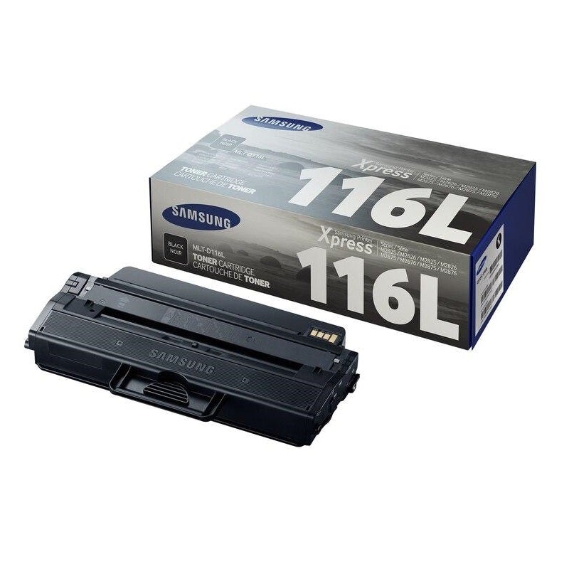 Samsung MLT-D116L Toner Cartridge Black, High Yield (MLT-D116L, XAA). Samsung toner MLT-D116L works with Samsung printer: SL-M2625D, 2626, 2825DW, 2826, 2835DW, 2836, 2675, 2676, 2875DW, 2876, 2885FW, 2886. Genuine Samsung toner top performance, reliability, and quality each time you print. MLT-D116L toner cartridge yield (approx.): 3,000 pages. What's in the box: New Original Samsung MLT-D116L High Yield Black Toner Cartridge.
