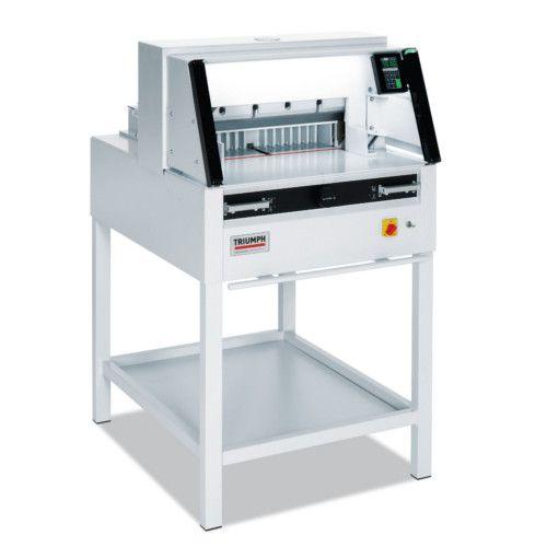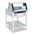 Ergonomic, 37 inch working height. Electric blade and clamp drive. Electric back gauge drive with touchpad for easy programming. Digital measurement display (cm or inches) with multilingual operator guidance, accurate to 1/10 mm or 1/100 inch. Stores 99 programs with up to 99 steps in each (up to 15 repeat cuts can be integrated as a single step). Pre-programmed for standard paper sizes. Memory key for repeat cuts. Automatic SET function for reference measurement and EJECT function for pushing out paper. Self-diagnostic system with error indication on display. Electronic back gauge control with variable speed control for manual back gauge setting. Bright, LED optical cutting line. 3-step, LED front table illumination. Adjustable, spindle guided back gauge with narrow separations and plastic gliders. Dual side guides on front and rear tables. High quality, German steel blade. Solid steel blade carrier and adjustable blade guides. All-metal construction. Includes stand with storage shelf, easy-access tool holder, and paper blocking tool. Optional side tables increase work surface. UL and C UL approved.
