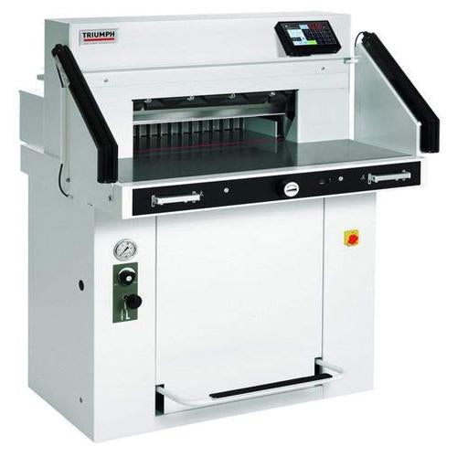 Hydraulic blade and clamp drive. Foot pedal for pre-clamping. Electric back gauge drives with touchpad for easy programming. Digital measurement display (cm or inches) with multilingual operator guidance, accurate to 1/10 mm or 1/100 inch. Stores 99 programs with up to 99 steps in each (up to 15 repeat cuts can be integrated as a single step). Pre-programmed for standard paper sizes. Memory key for repeat cuts. Automatic SET function for reference measurement and EJECT function for pushing out paper. Self-diagnostic system with error indication on display. Electronic back gauge control with variable speed control for manual back gauge setting. Clamp pressure is fully adjustable between 1,900 and 3,800 psi. False clamp plate. Bright, LED optical cutting line. Stainless steel work surface. High-quality, German HSS blade. Precision swing cut blade movement. Aluminum blade carrier and clamp bar. Adjustable blade guides. All-metal construction. Mounted on casters. Includes easy-access tool holder and paper-blocking tool. Optional side tables increase the work surface. UL and C UL approved.